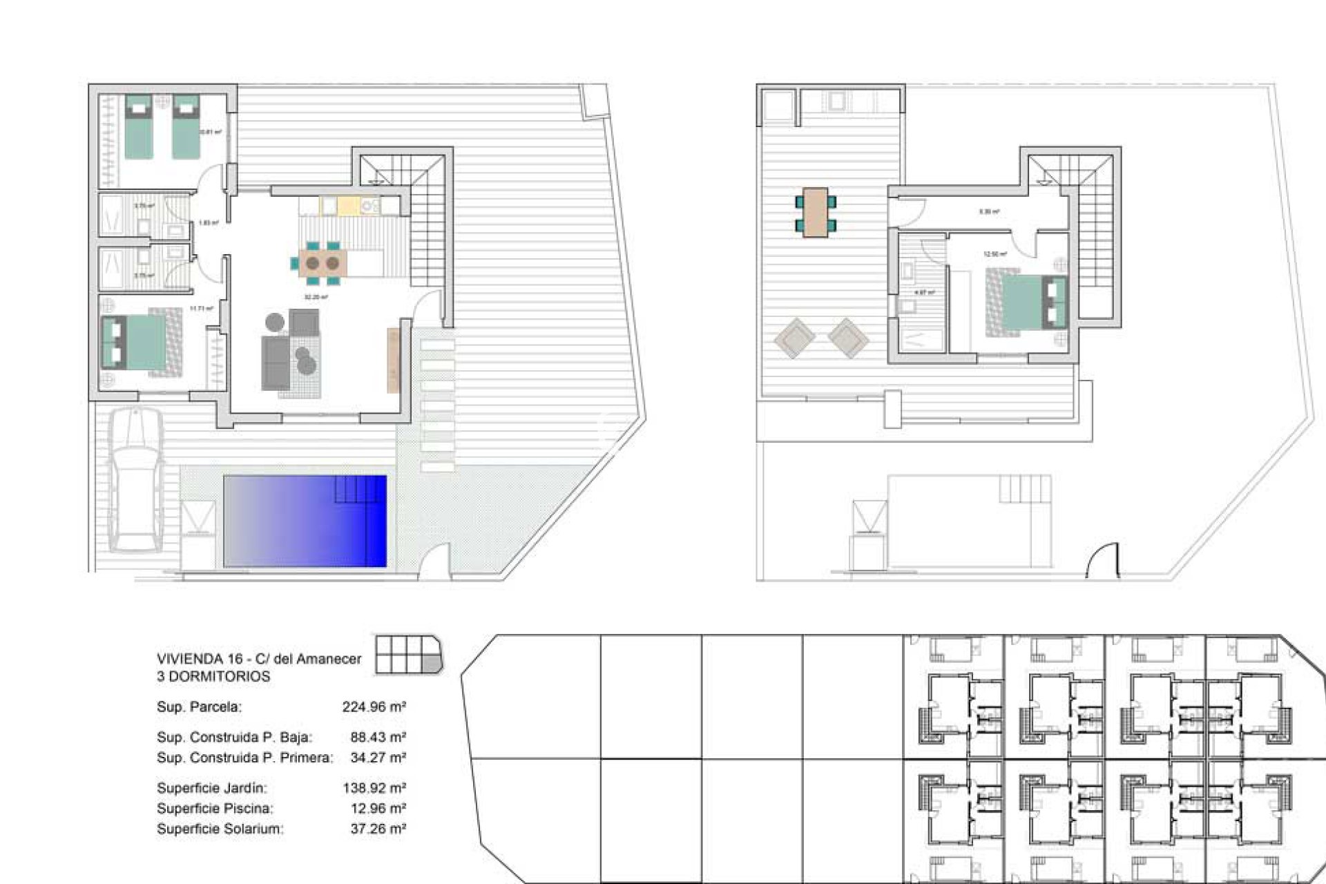 Cada vivienda cuenta con un jardín privado, perfecto para disfrutar del clima mediterráneo y organizar reuniones al aire libre. Además, las propiedades incluyen una terraza y un solárium, ofreciendo múltiples espacios para el ocio y el relax. La inclusión de una piscina privada en cada vivienda añade un toque de lujo y exclusividad, permitiendo disfrutar de un refrescante baño en la privacidad de tu hogar.