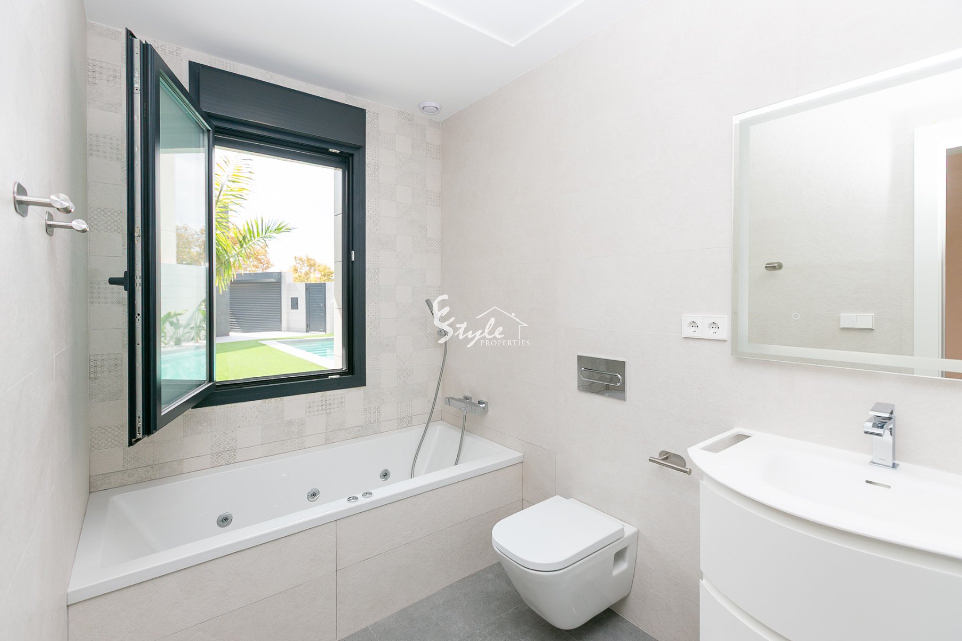 Piscina privada con zona de descanso, hidromasaje y cuello de cisne hidrante, perfecta para disfrutar del clima mediterráneo.
