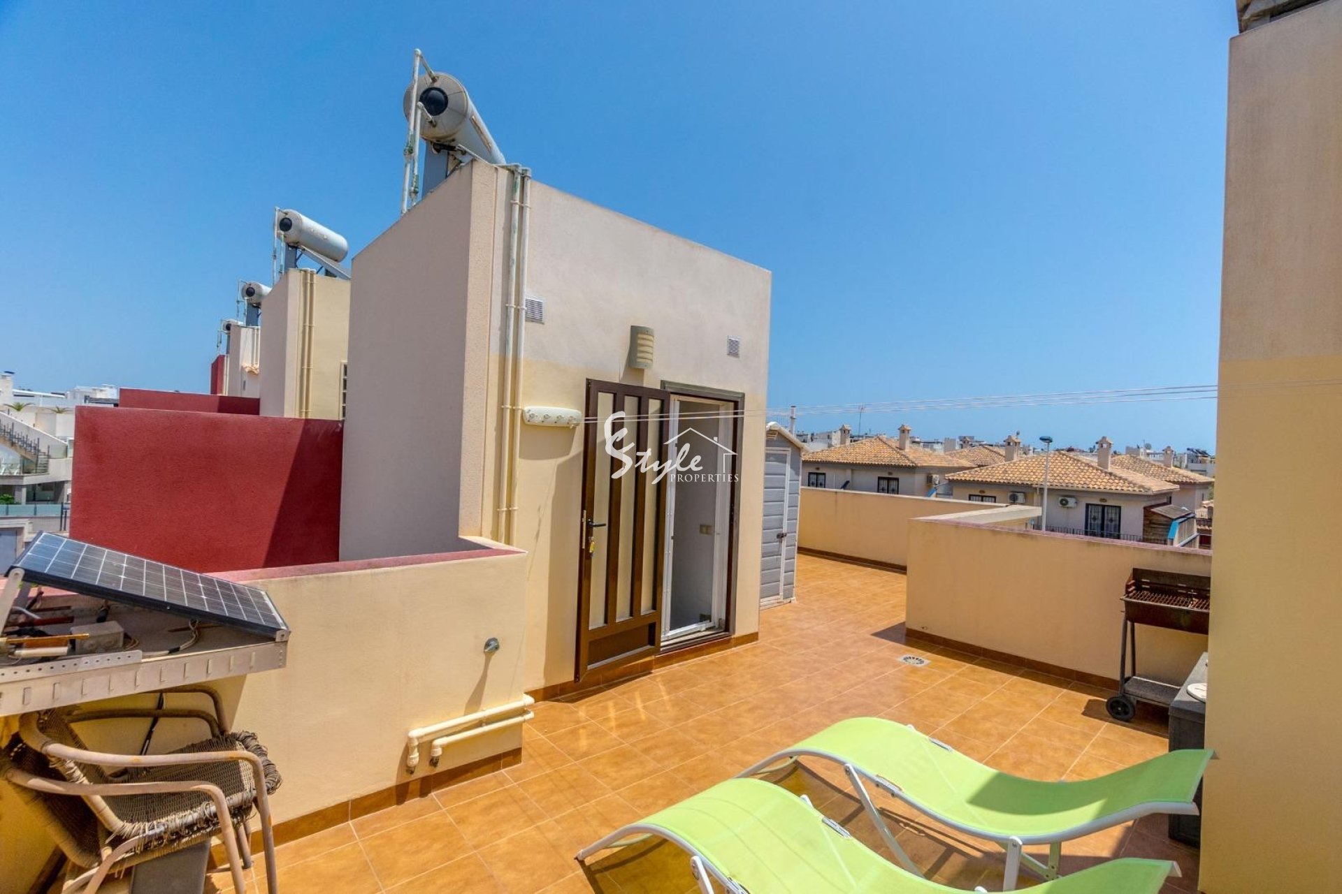 Los espacios exteriores son un verdadero privilegio: una terraza delantera de 43 m² con muebles de ratán, un patio trasero íntimo, un balcón en la planta superior y un solárium privado de 40 m², perfectos para disfrutar del sol y del estilo de vida mediterráneo durante todo el año.