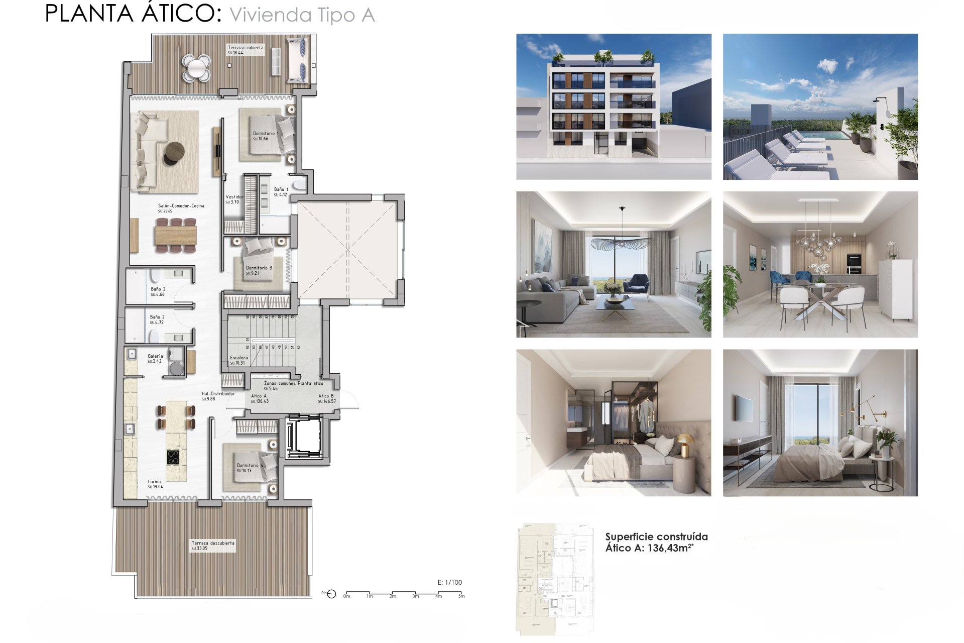 Los exteriores de estas viviendas están pensados para maximizar el disfrute del clima mediterráneo. Todas las propiedades cuentan con terrazas, perfectas para relajarse mientras se contempla el mar. Además, el residencial dispone de un solárium comunitario, ideal para tomar el sol y disfrutar de las vistas panorámicas. La cercanía al mar, a solo 700 metros, permite disfrutar de la playa en cualquier momento.