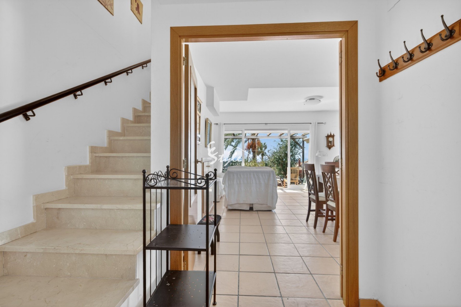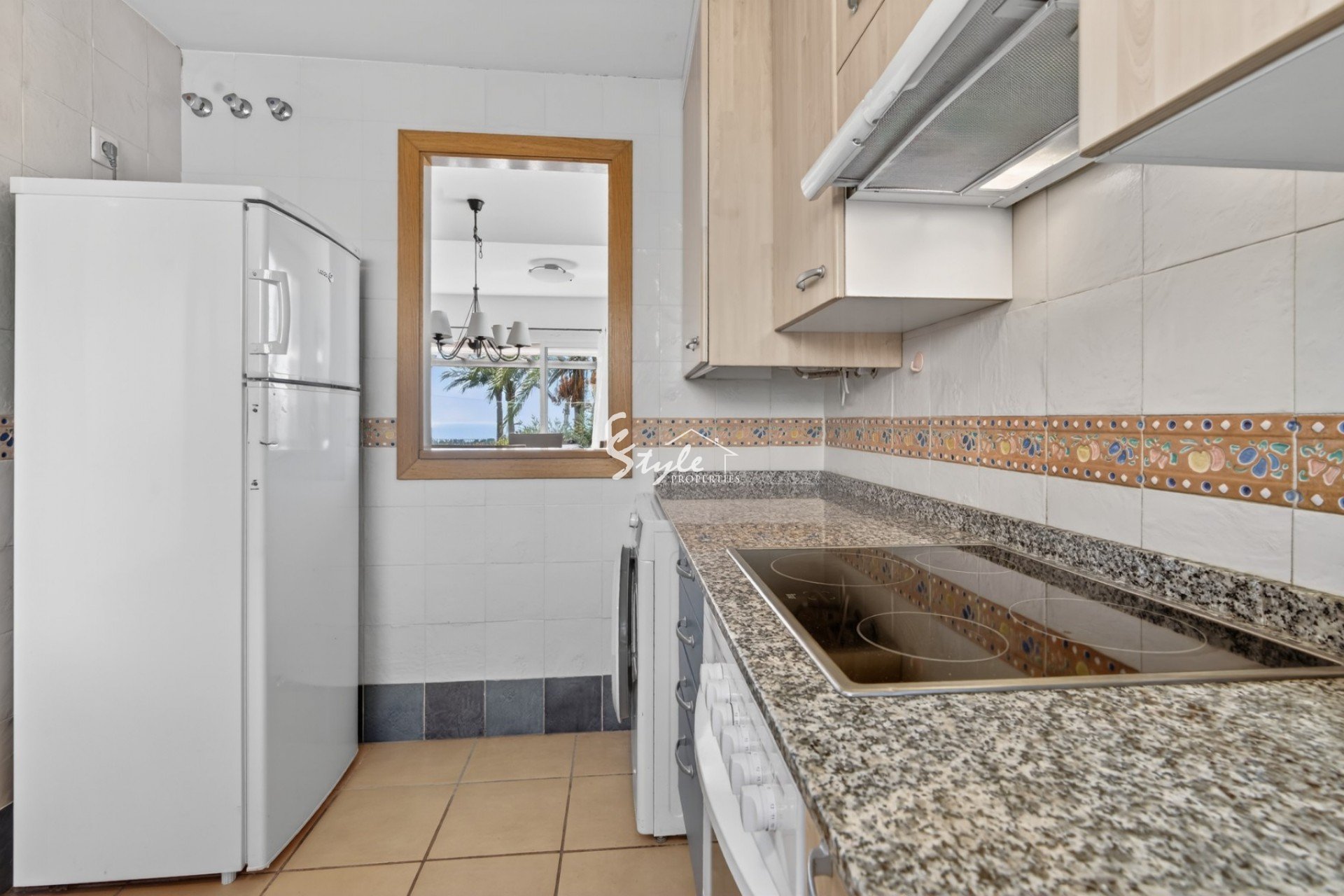 El salón es amplio y luminoso, con acceso directo a la terraza y al jardín. Desde aquí se pueden disfrutar vistas abiertas al Mediterráneo y a las cuidadas zonas comunes. La cocina está ligeramente independiente, pero conectada con el salón, creando un espacio práctico y funcional.