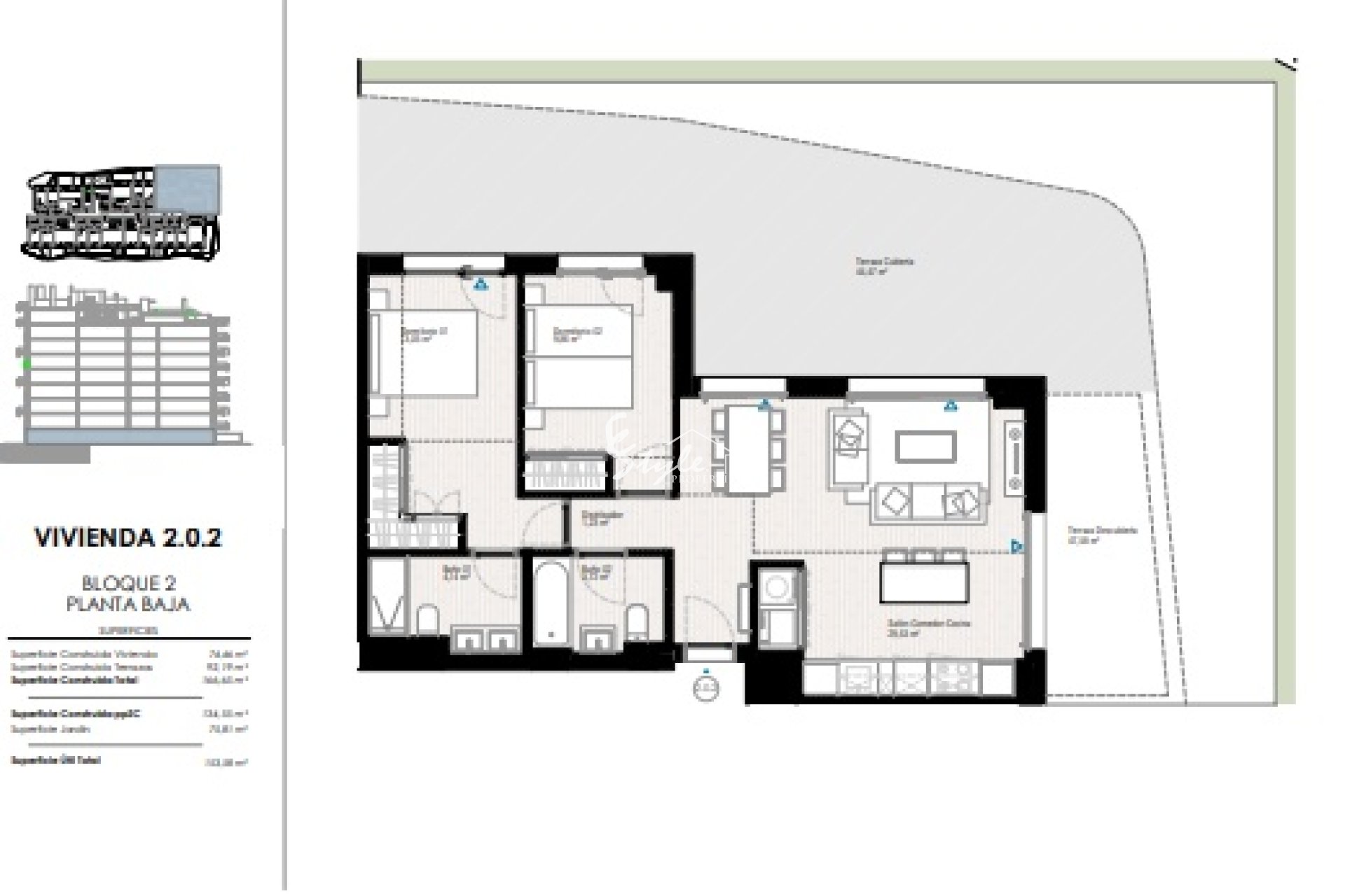 Los exteriores de estas viviendas están diseñados para aprovechar al máximo el clima mediterráneo. Cada propiedad cuenta con una terraza privada, ideal para disfrutar de las vistas y del aire libre. Las plantas bajas ofrecen la ventaja adicional de un jardín privado, mientras que los áticos incluyen un solárium, perfecto para tomar el sol en la privacidad de tu hogar. Además, todas las viviendas disponen de garaje, lo que añade comodidad y seguridad al día a día. La cercanía al mar, a solo 400 metros, permite disfrutar de paseos costeros y actividades acuáticas en cualquier momento.