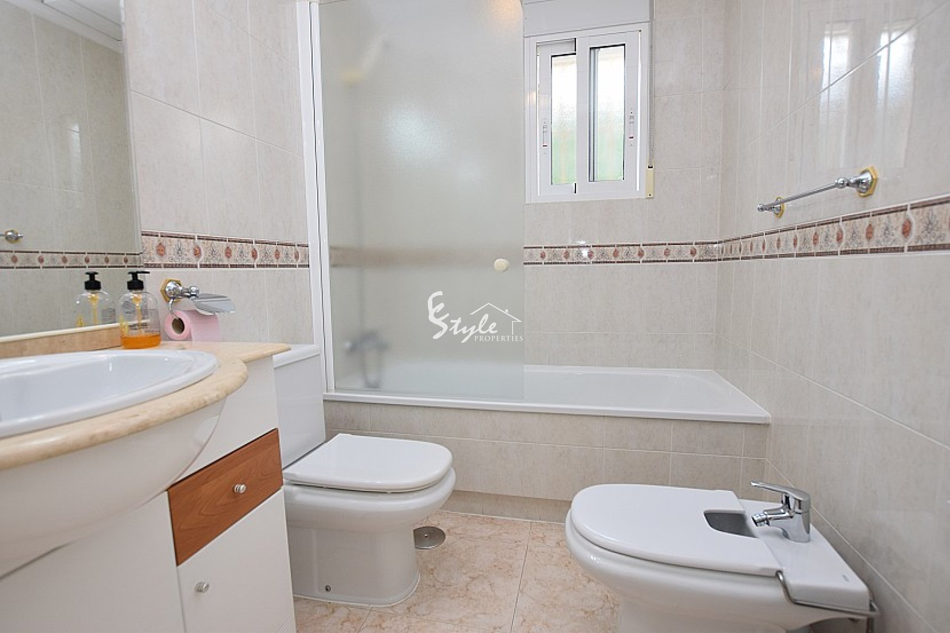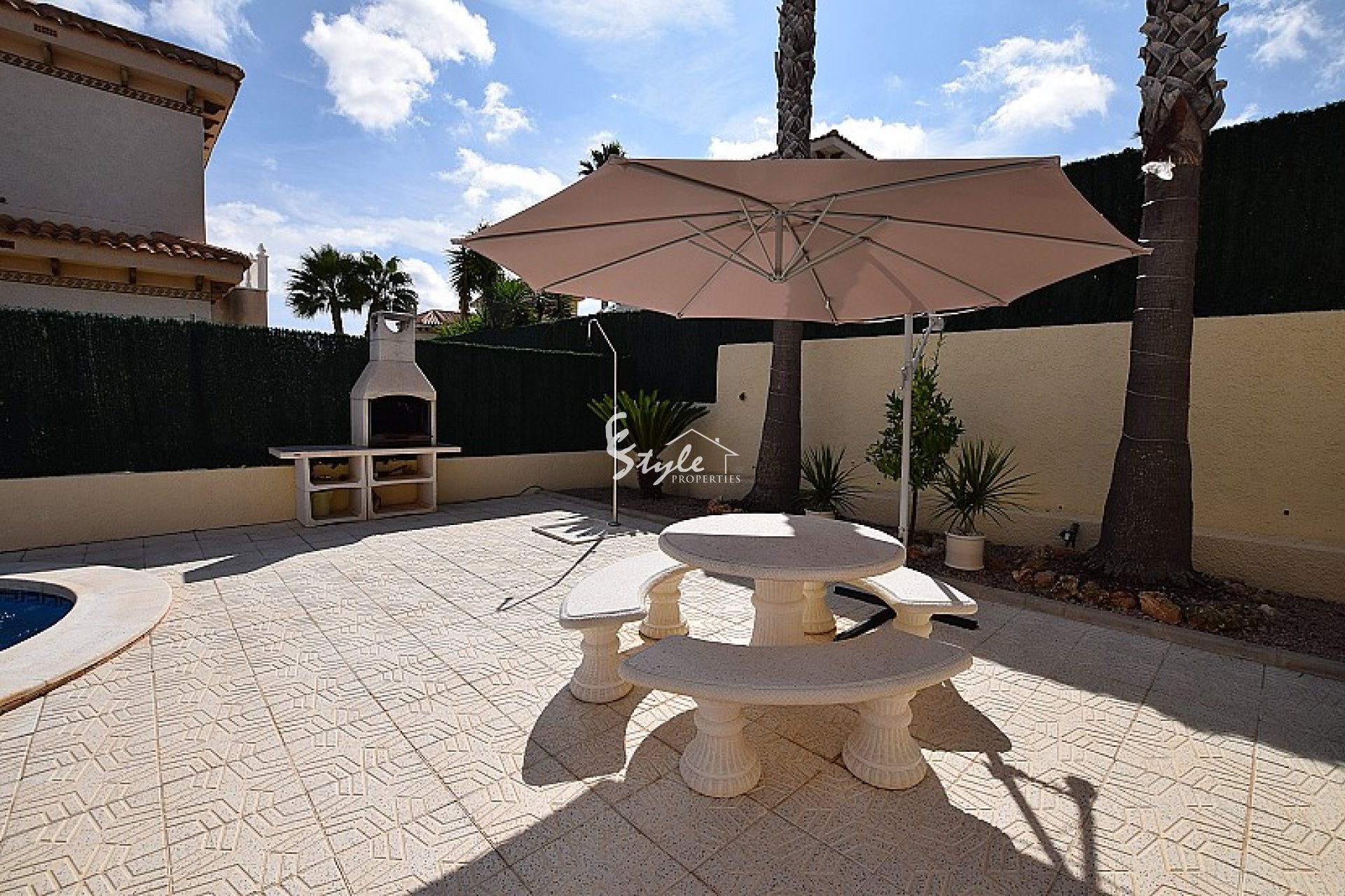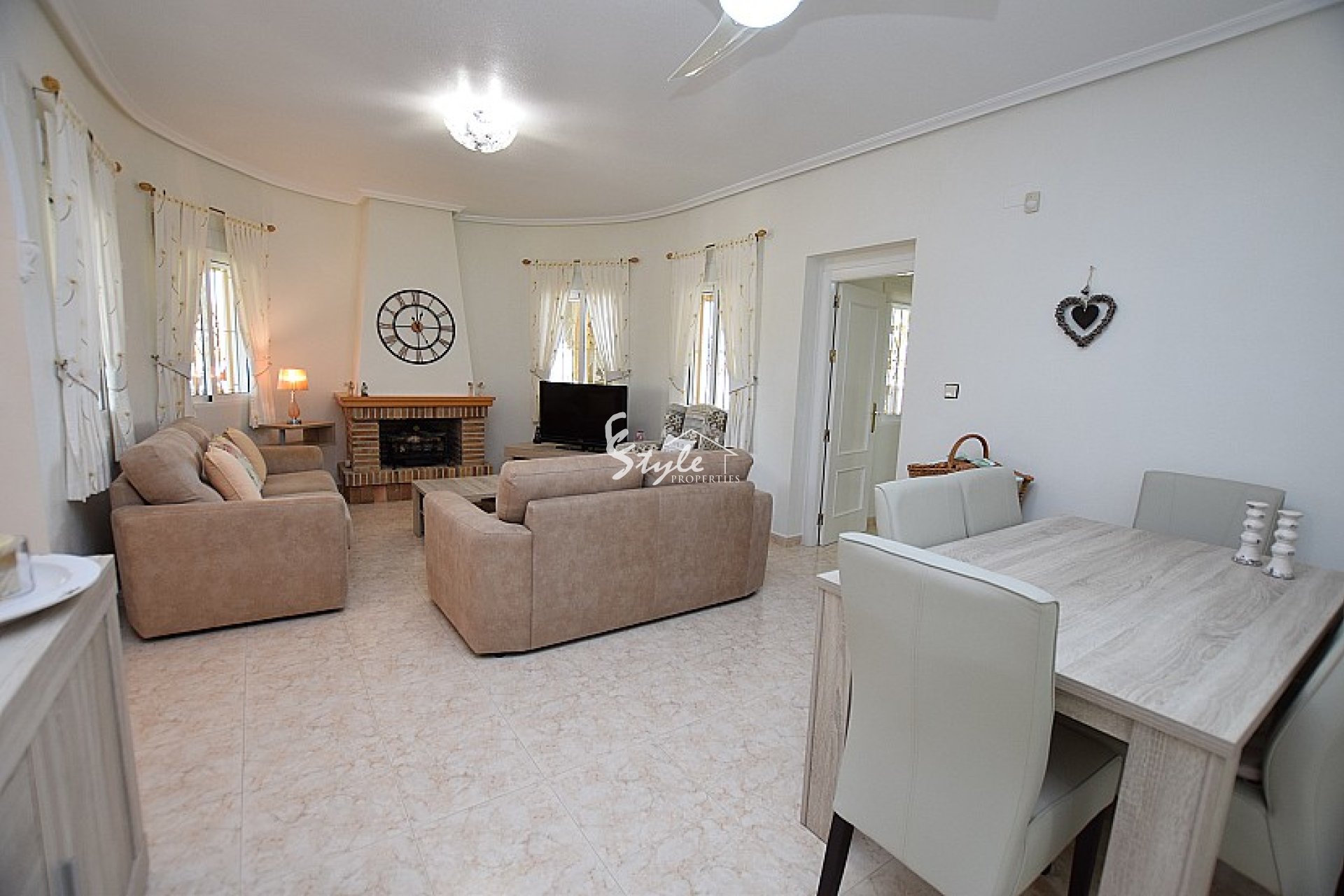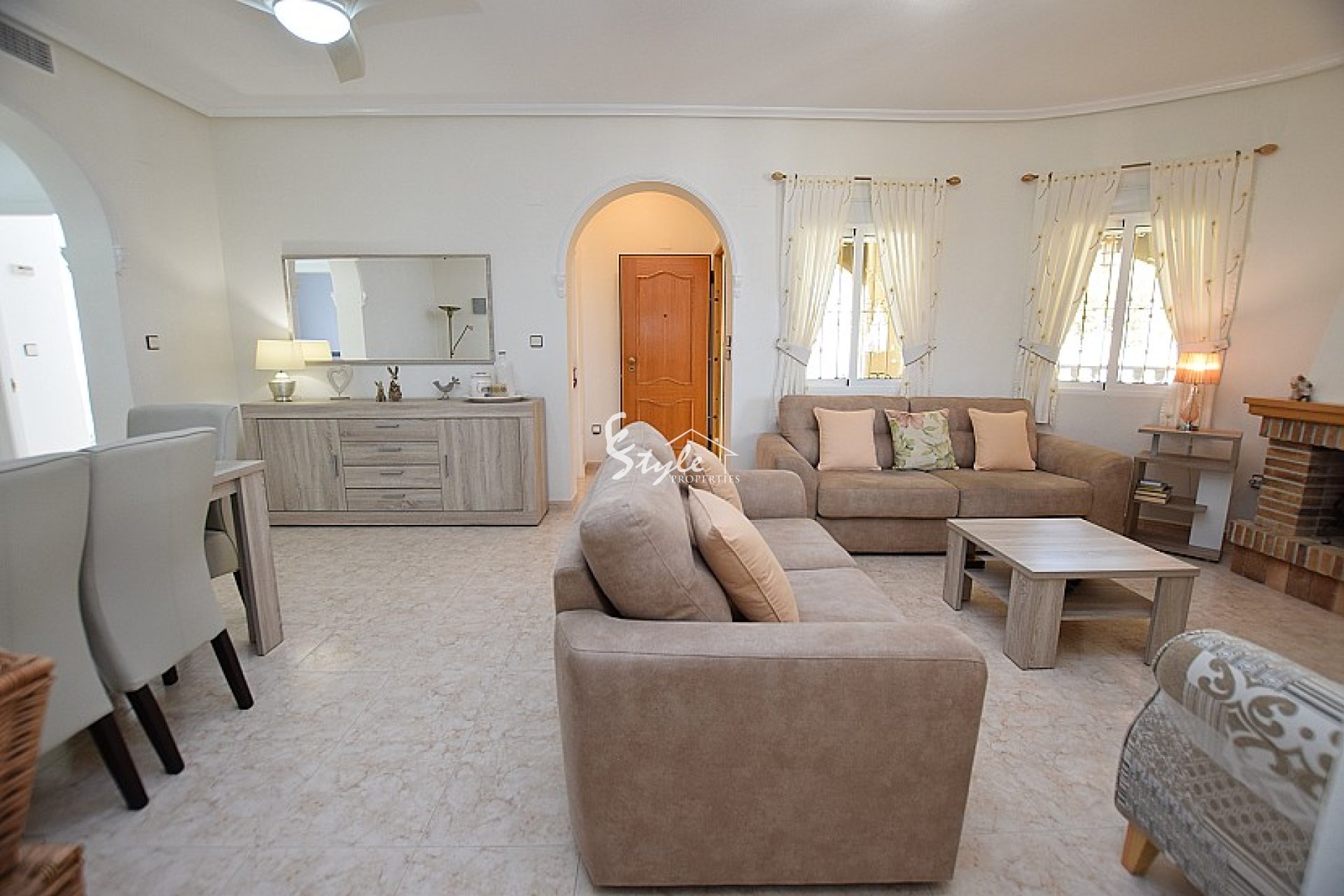 Villa independiente con piscina grande en venta en la codiciada zona de Villas Maria, Orihuela Costa. Esta casa es muy luminosa, para proporcionar una vida con mucha luz natural y disfrutar del clima mediterránea. Está ubicada en San Miguel de Salinas en un pueblo tranquilo con villas de alto valor, diseñadas individualmente y conocidas como las Beverly Hills de los alrededores, a menos de 10 km del mar y las playas. La vivienda dispone de una parcela privada, zona ajardinada y una piscina. La casa consta de 3 habitaciones, 3 baños, cocina medio abierta, amplio salón-comedor con chimenea, una bonita terraza acristalada con orientación al norte en la entrada con un comedor abierto español.