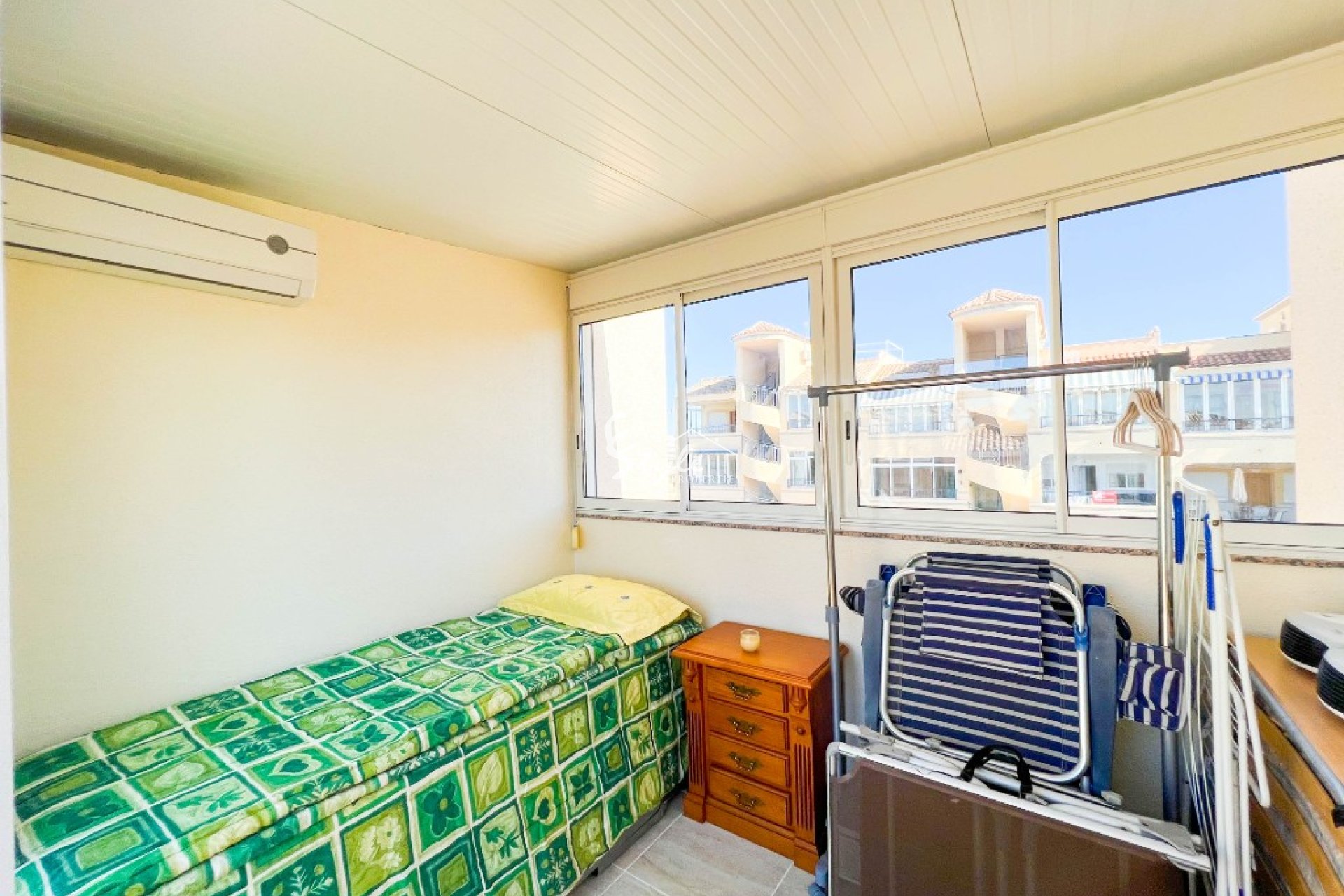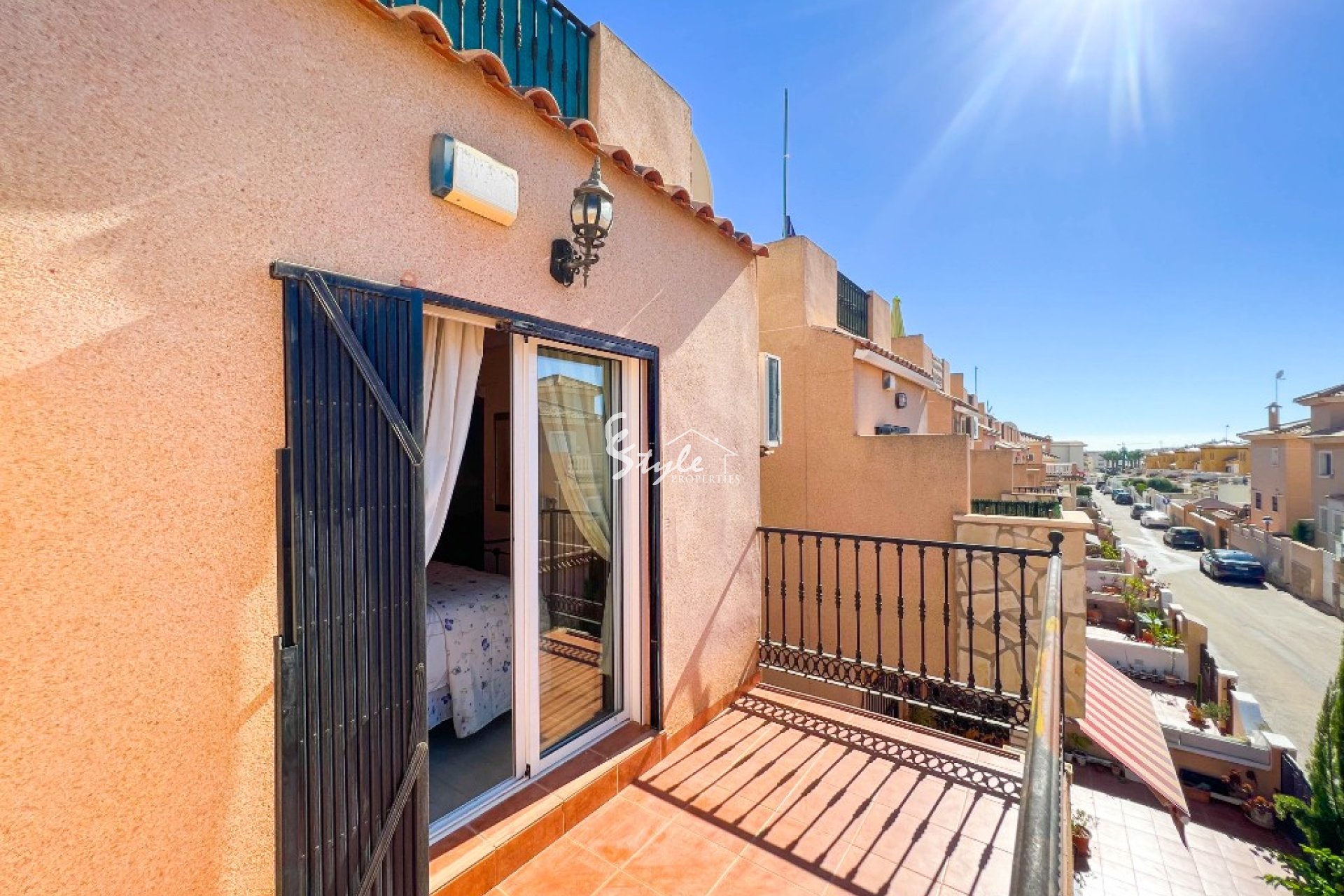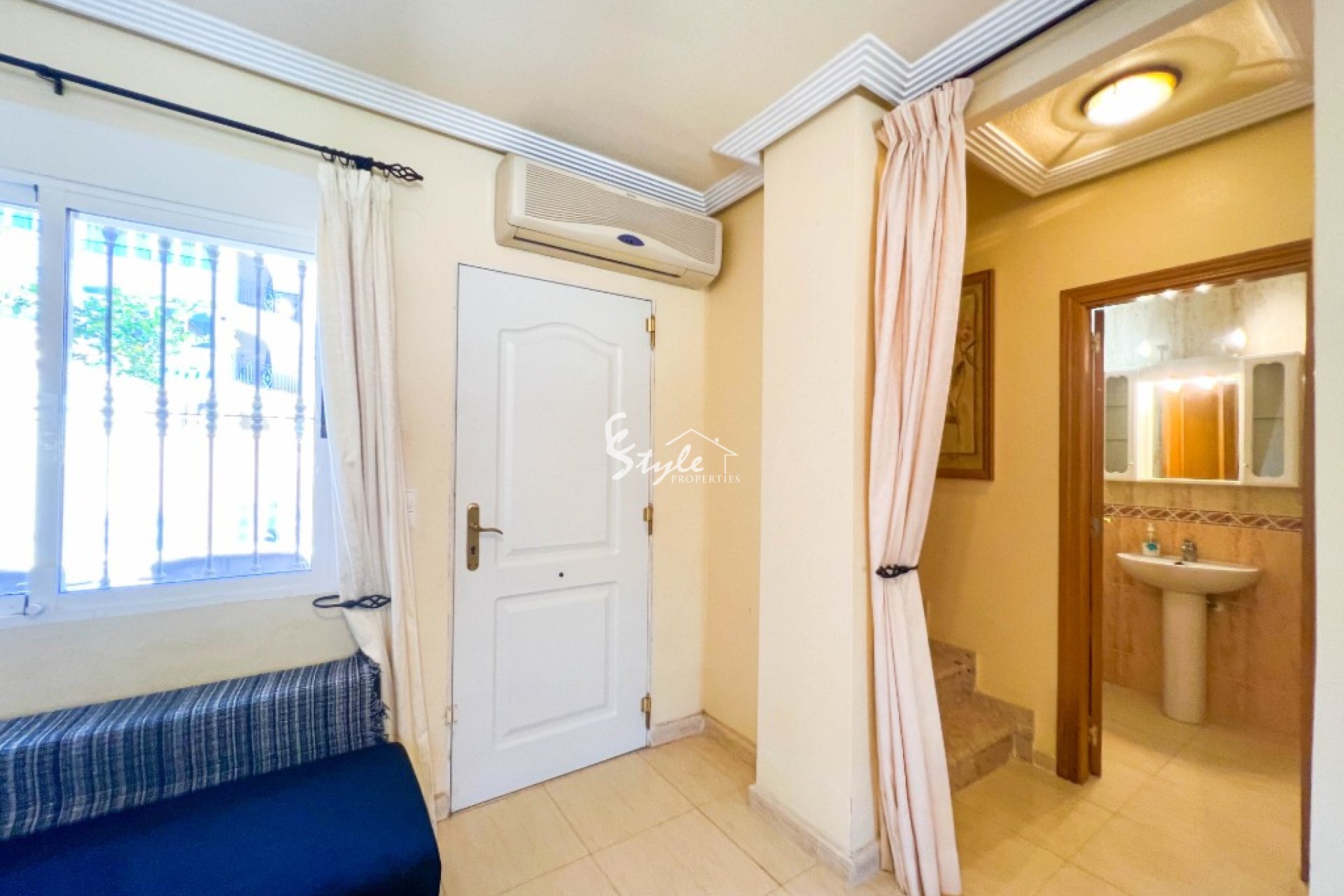 Dos dormitorios y un baño se encuentran en el primer piso y uno tiene una terraza orientada al sur que ofrece vistas al mar. El tercer dormitorio se encuentra en el segundo piso y a través de una puerta corredera francesa puede ir a un solarium privado. La casa está totalmente equipada con aire acondicionado y se vende completamente amueblada.
