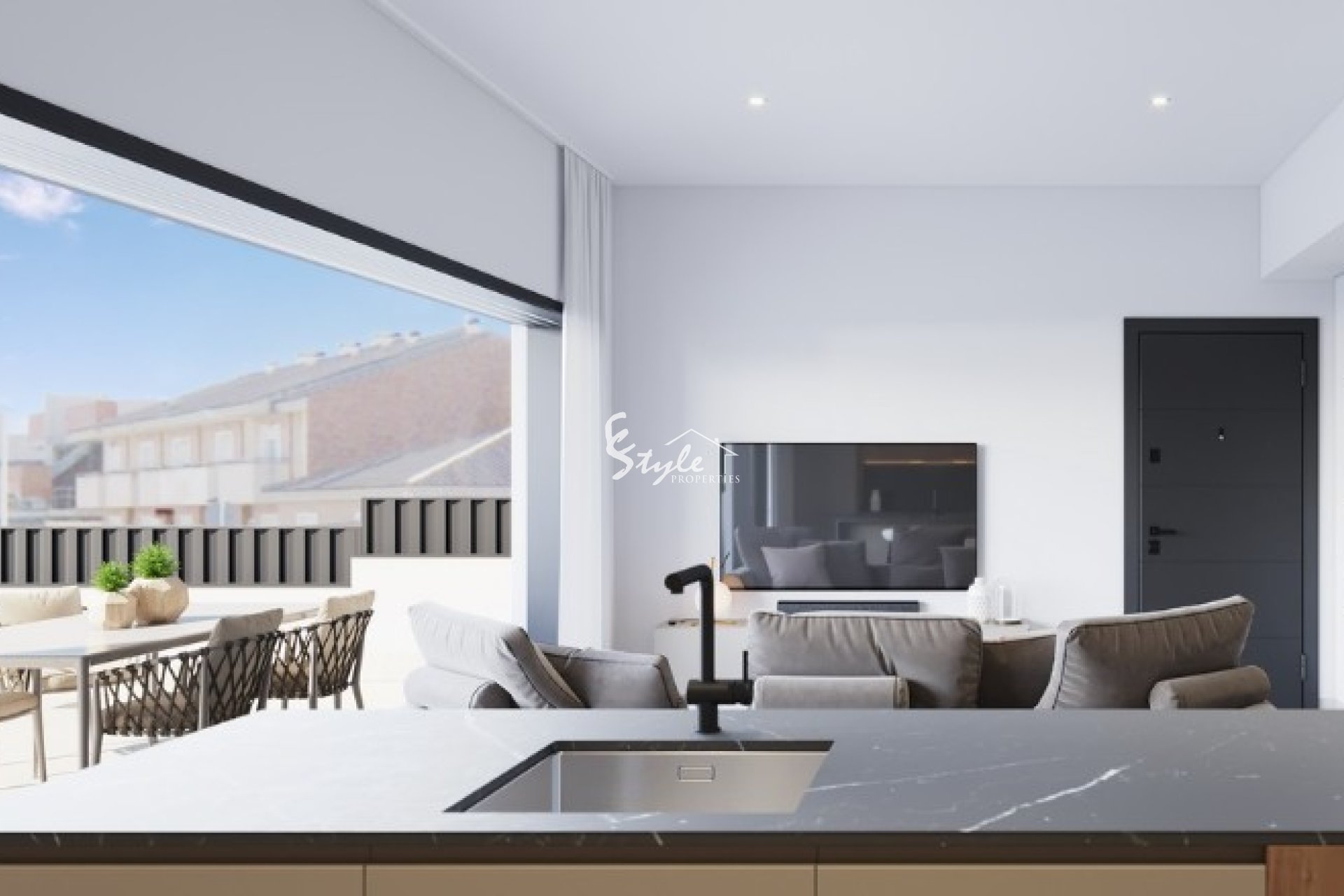 La propiedad de nueva construcción está ubicada en un complejo cerca de todos los servicios. El apartamento de planta alta cuenta con 3 dormitorios, 2 baños con suelo radiante, salón, cocina completa con electrodomésticos Bosch o Siemens, terraza, solárium, piscina privada y aparcamiento.