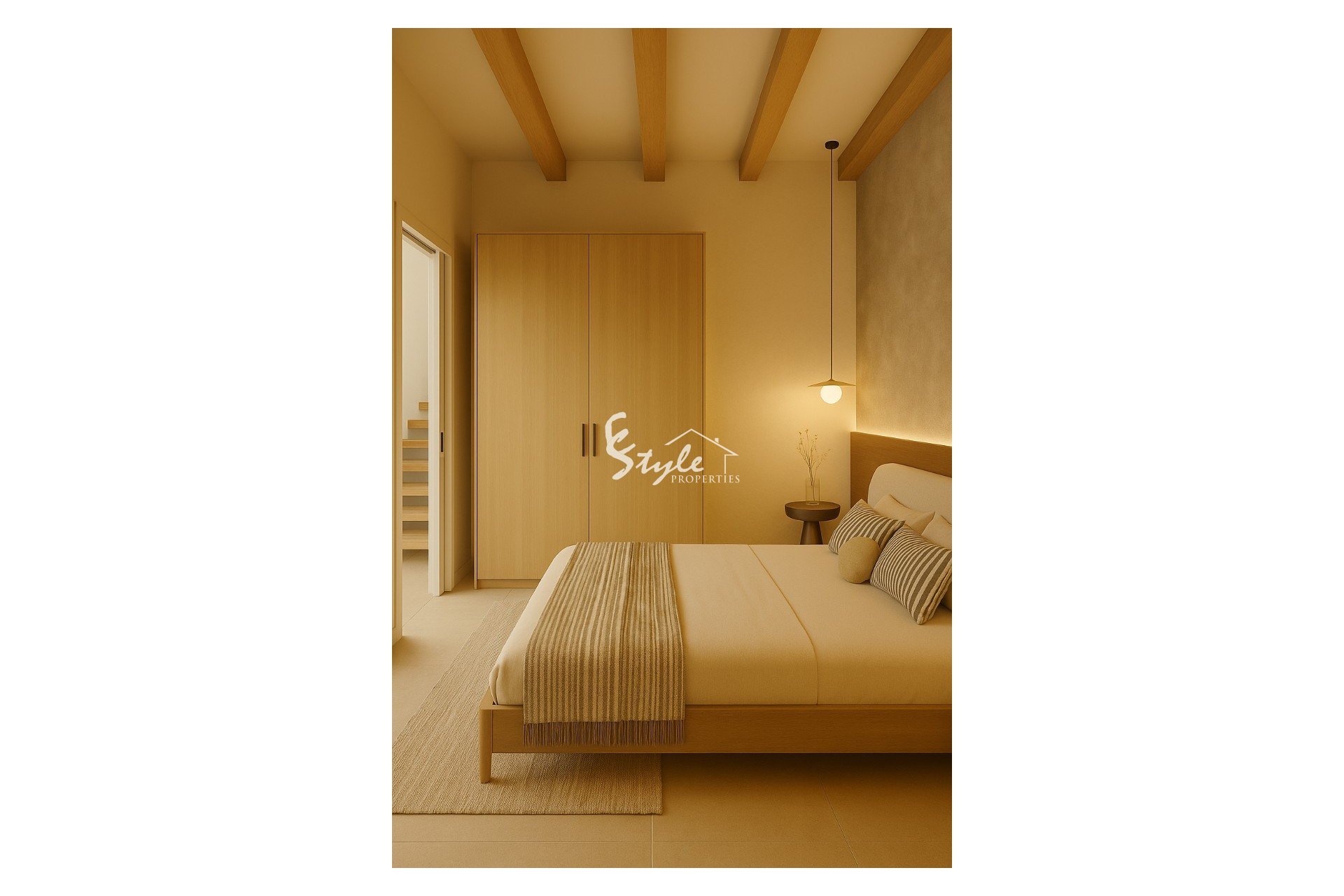 Upon entering the property, a private staircase leads to the main level, where you’ll find a bright two-bedroom, two-bathroom apartment designed in a contemporary style with natural materials. The main area offers an open-plan living-dining-kitchen space of over 30 m², bright and welcoming, with access to a small balcony.