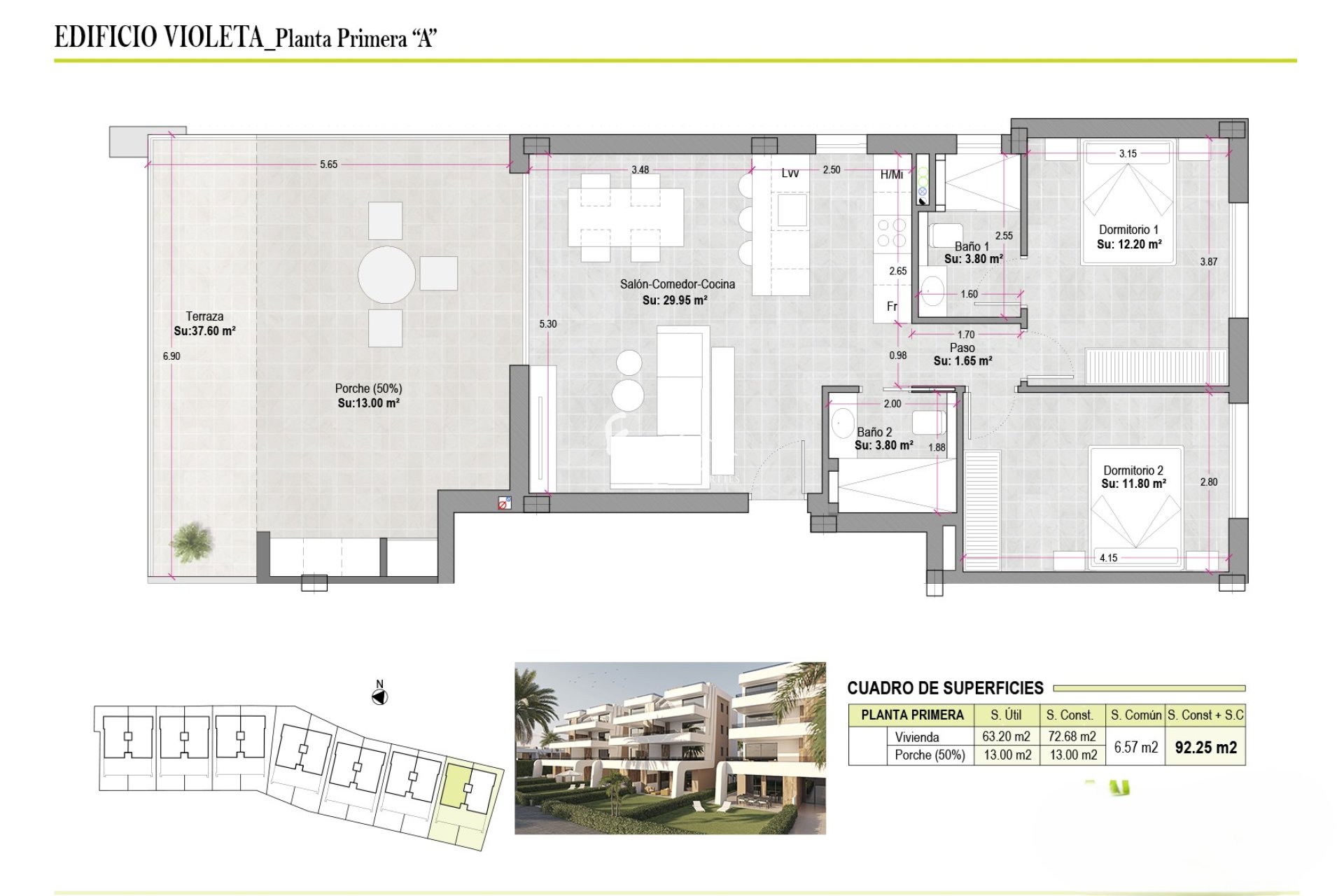 The properties feature outdoor spaces designed to enjoy the Mediterranean climate. Each home has a terrace, ideal for outdoor relaxation. Ground floors offer private gardens, while penthouses include a solarium, providing additional space for leisure and relaxation. Additionally, all properties have access to a garage, ensuring convenience and security for residents' vehicles.