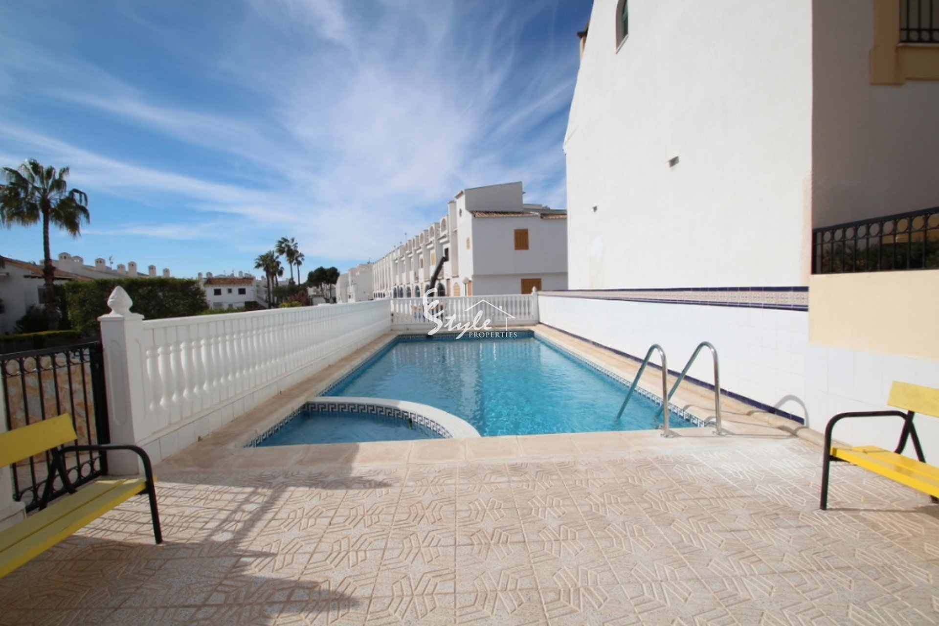 Townhouse by the sea in a closed urbanization with a swimming pool in La Zenia. The house has a courtyard for relaxation, 3 bedrooms, 2 bathrooms, a separate furnished kitchen with access to the patio, a spacious living room. Urbanization is located in the heart of the infrastructure, just 400 meters from the sea and the spacious beaches of La Zenia and 1 km from the large shopping center Zenia Boulevard.