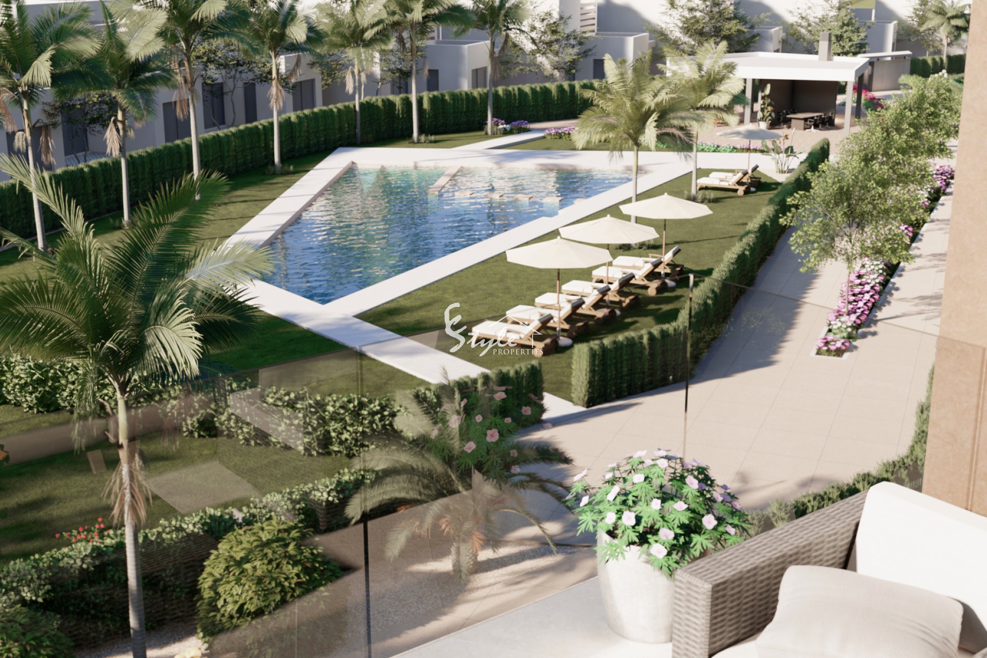 Внешние территории этого жилого комплекса спроектированы для создания приятной и функциональной среды. Дома имеют частные террасы, идеальные для наслаждения средиземноморским климатом и расслабляющими моментами на свежем воздухе. Кроме того, общие зоны включают ухоженные сады, которые предоставляют зеленое и спокойное пространство для всех жителей. Наличие общего бассейна добавляет элемент роскоши, позволяя освежиться и пообщаться в безопасной и контролируемой обстановке.
