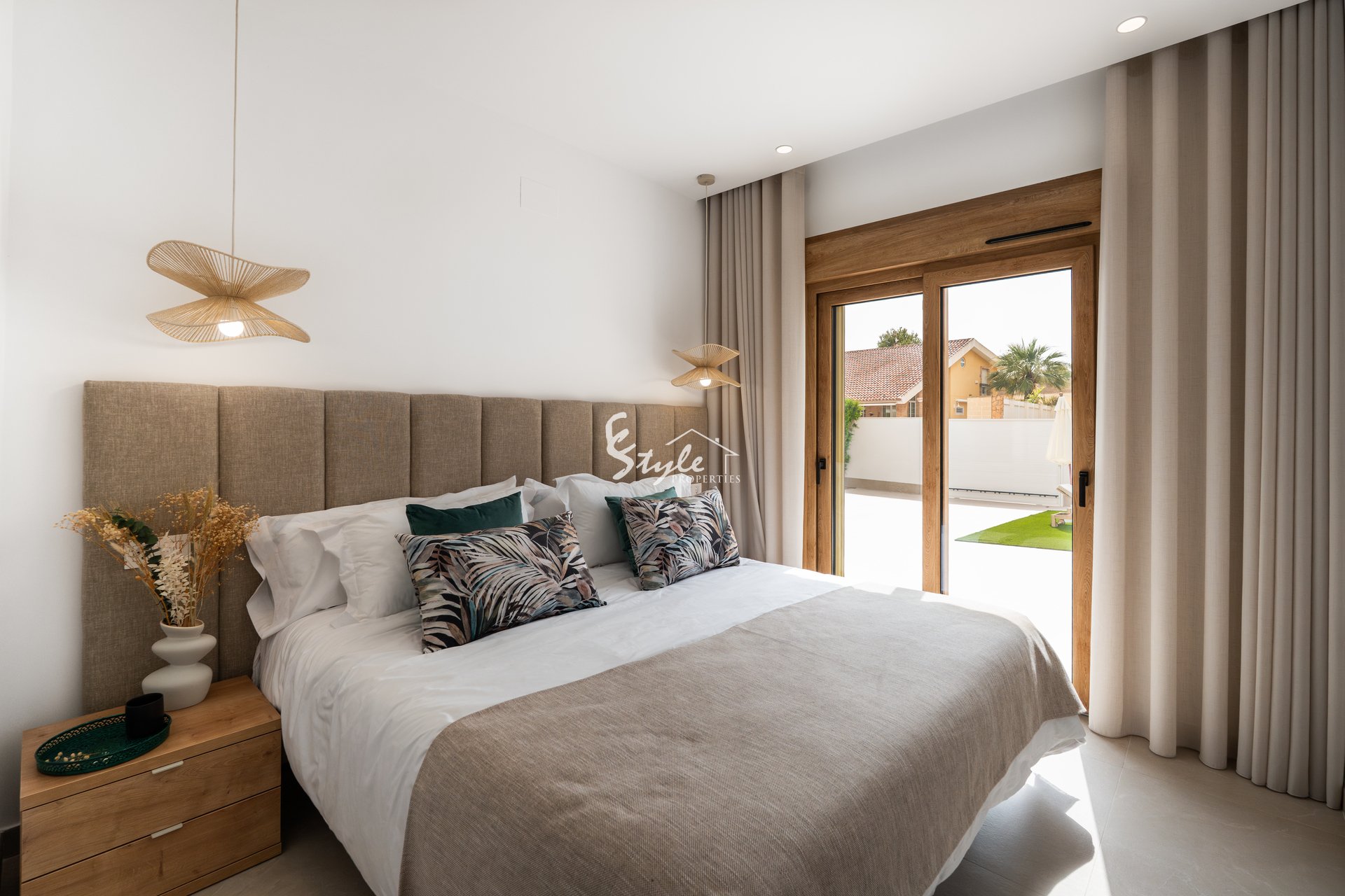 Интерьер виллы оснащен современными и высококачественными характеристиками. Полы из керамогранита придают элегантный вид и легки в уходе. Вилла полностью меблирована, что облегчает переезд и позволяет наслаждаться комфортом с первого дня. Кухня оборудована новейшей техникой, что делает приготовление пищи приятным занятием. Система кондиционирования воздуха обеспечивает свежую атмосферу круглый год. Электрические жалюзи и видеодомофон добавляют дополнительный уровень удобства и безопасности. Встроенные шкафы в спальнях предлагают много места для хранения.