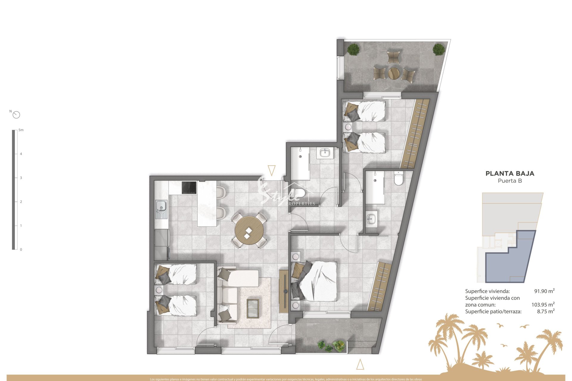 Интерьеры недвижимости спроектированы для обеспечения комфорта и стиля. Квартиры, квартиры на первом этаже и пентхаусы оснащены керамическими полами, которые придают современный вид и легки в уходе. Кухни оборудованы бытовой техникой, что облегчает повседневную жизнь и позволяет наслаждаться готовкой с первого дня. Встроенные шкафы в спальнях предлагают много места для хранения, поддерживая порядок и организацию. Недвижимость доступна в конфигурациях с 2 и 3 спальнями, с 2 ванными комнатами, адаптируясь к различным семейным потребностям и стилям жизни. Планировка включает террасы, предоставляя дополнительное пространство для отдыха и релаксации.