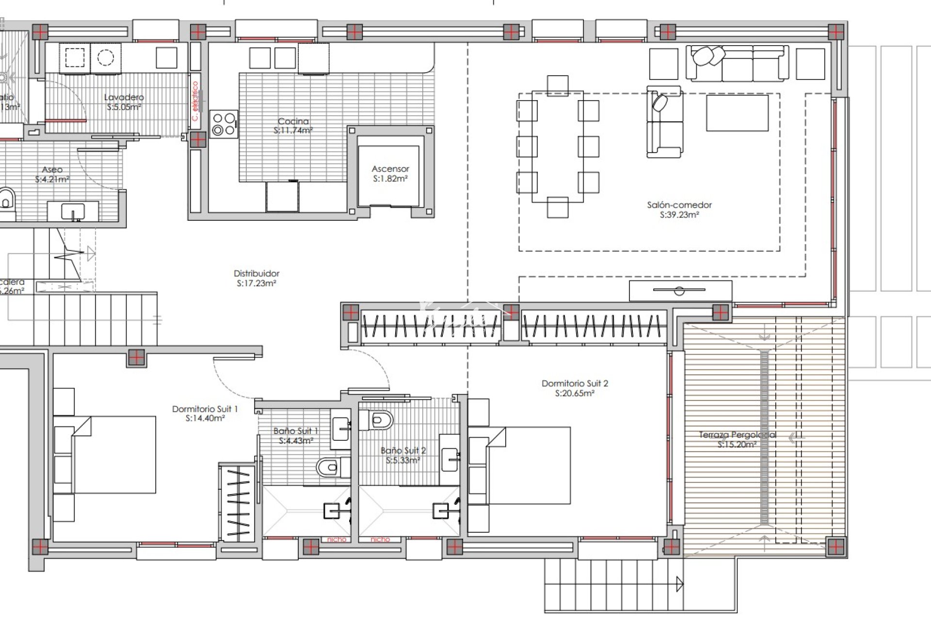 Интерьер виллы тщательно продуман для обеспечения максимального комфорта и функциональности. В собственности четыре спальни, каждая с собственной ванной комнатой, что гарантирует приватность и удобство для всех жителей. Встроенные шкафы предоставляют достаточно места для хранения, поддерживая порядок и организацию в доме. Подогрев пола обеспечивает приятную температуру в течение всего года, а высококачественная бытовая техника облегчает выполнение повседневных задач. Дизайн интерьера сочетает в себе элегантность и практичность, создавая уютную и современную атмосферу, которая приглашает наслаждаться каждым уголком дома.