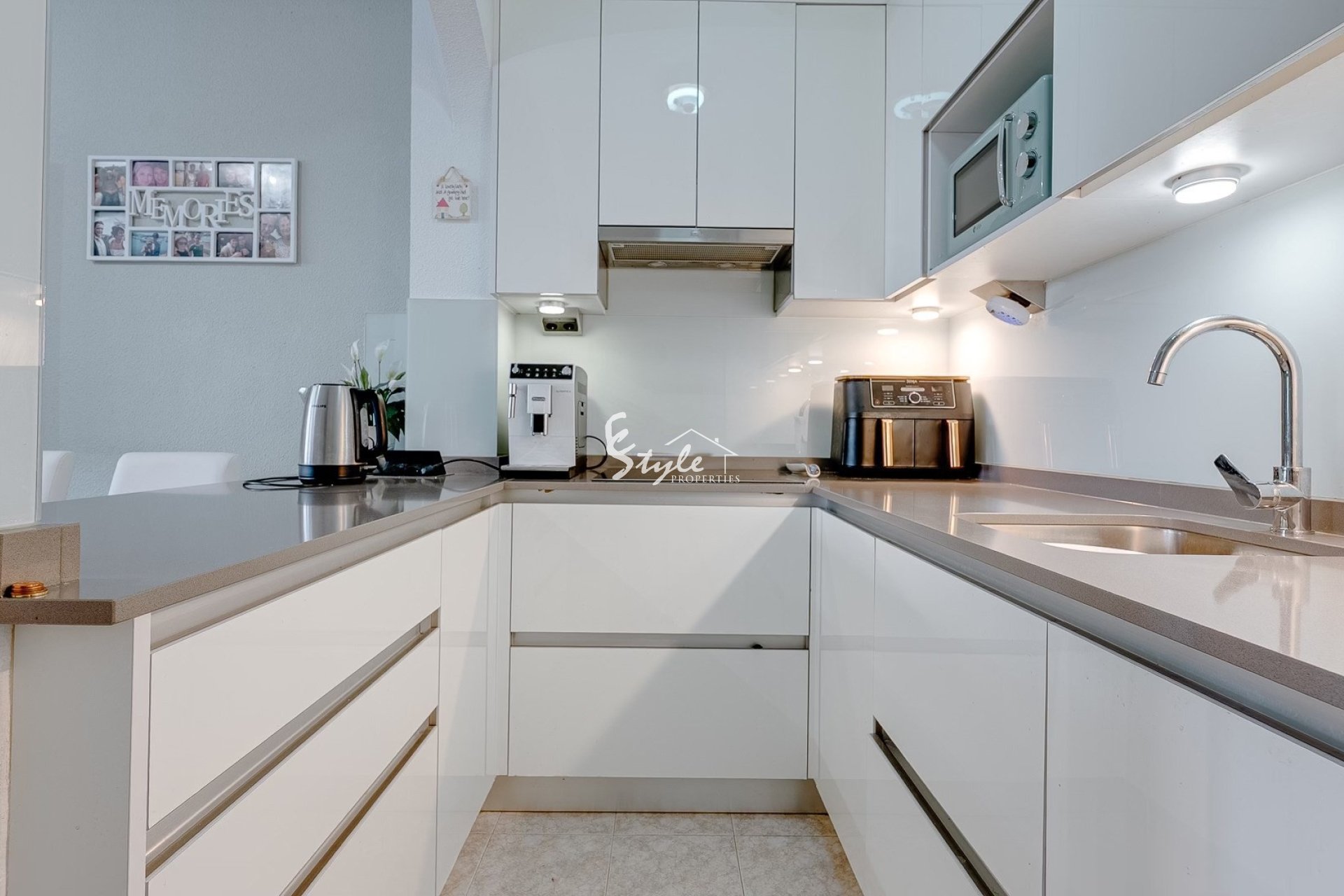 Перед входом обустроена элегантная терраса — идеальное место для утреннего кофе или ужинов на свежем воздухе под средиземноморским солнцем. На первом уровне расположен просторный и светлый салон с обеденной зоной и кухней открытого типа. Кухня полностью обновлена, выполнена в современном стиле и оснащена качественной бытовой техникой. Также на этом этаже находится стильная ванная комната с душевой кабиной.
