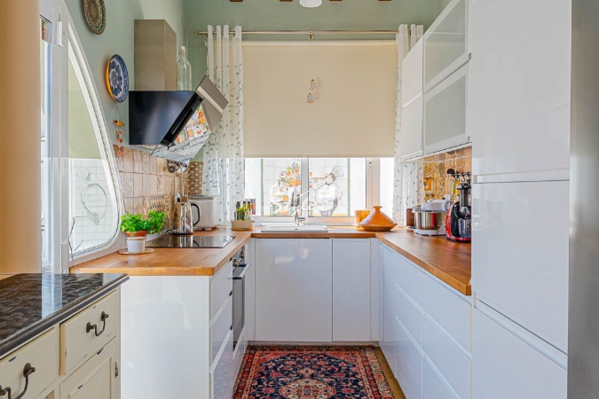 Дом включает летнюю кухню, наружный душ и стильную кухню с техникой Siemens и деревянными балками.