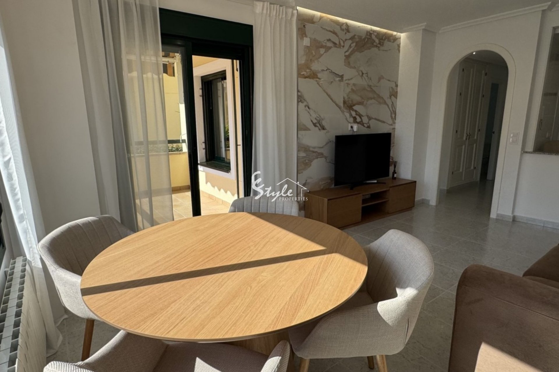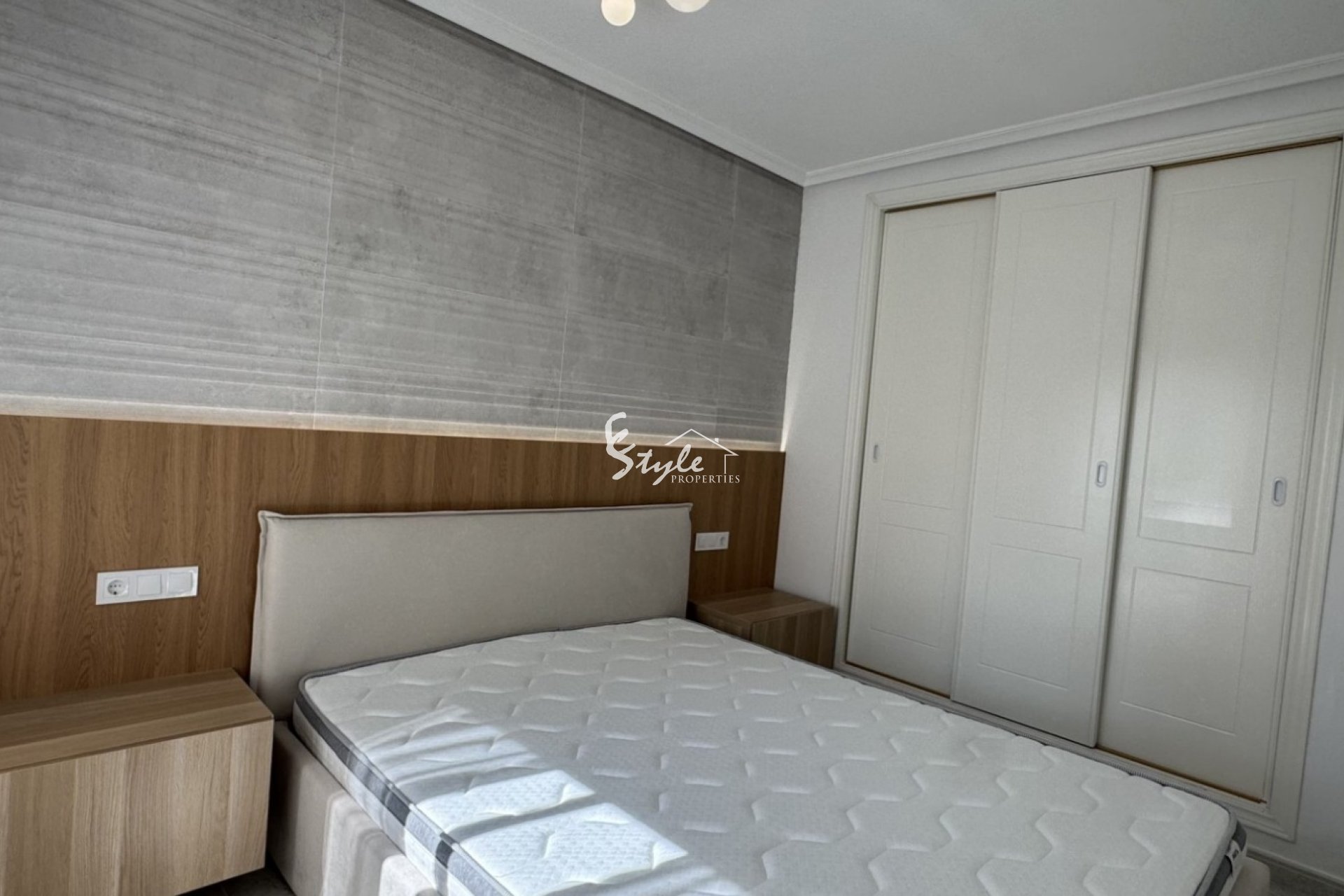 Площадь — 83 м², включает 2 спальни и 2 ванные комнаты, одна с душевой кабиной walk-in. Использованы высококачественные материалы: крупноформатная плитка и натуральный камень. Просторная гостиная и полностью оборудованная кухня.