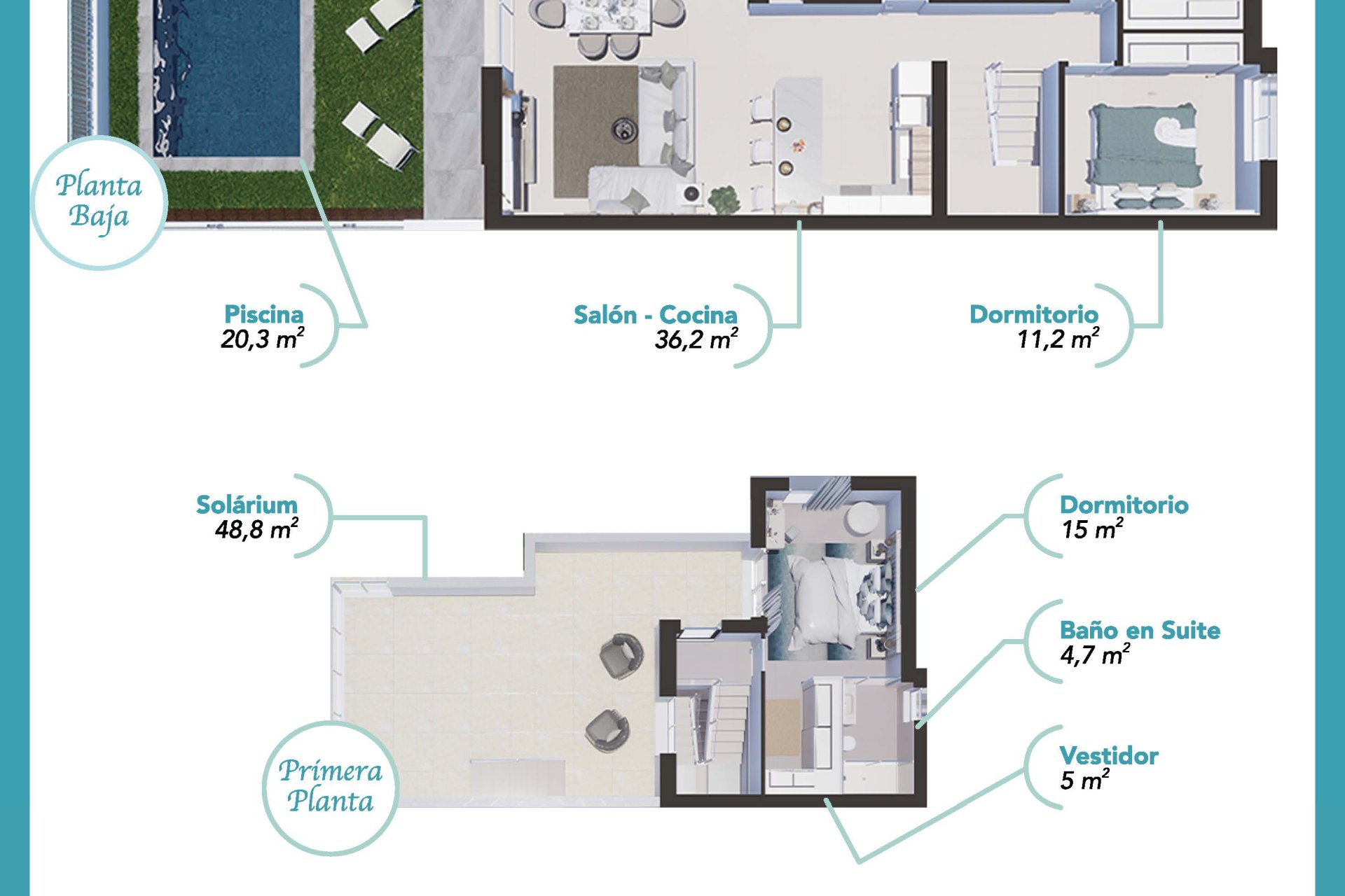 Экстерьеры этих таунхаусов разработаны для максимального наслаждения средиземноморским климатом. Каждое жилье имеет частный сад, идеальный для создания личного зеленого пространства или для наслаждения моментами на свежем воздухе. Просторные террасы предлагают идеальное место для отдыха, принятия солнечных ванн или обедов на свежем воздухе. Кроме того, каждый таунхаус включает в себя солярий, предоставляя дополнительное пространство для наслаждения видами и солнечной погодой в течение всего года. Наличие гаража обеспечивает удобство и безопасность для парковки автомобилей.