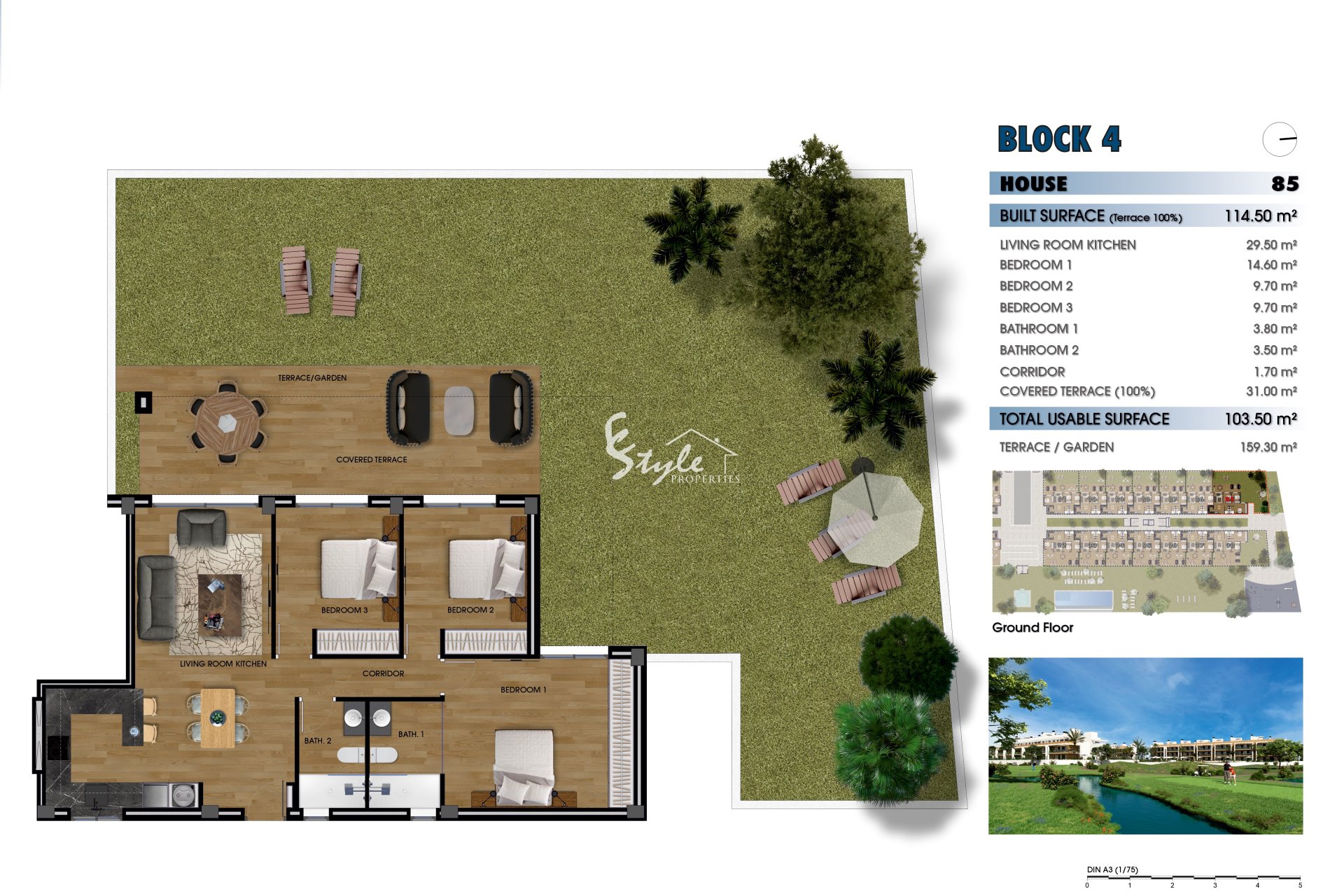 Экстерьеры этих домов спроектированы для обеспечения непревзойденного образа жизни на открытом воздухе. Каждая собственность имеет террасу, идеально подходящую для наслаждения видами и средиземноморским климатом. Кроме того, некоторые типы включают частный солярий, идеально подходящий для отдыха на солнце. Дома на первом этаже имеют частные сады, предоставляя личное зеленое пространство для отдыха с семьей или друзьями. Для тех, кто ищет дополнительную роскошь, некоторые объекты имеют частный бассейн, предлагая личный оазис для освежения в жаркие летние дни.