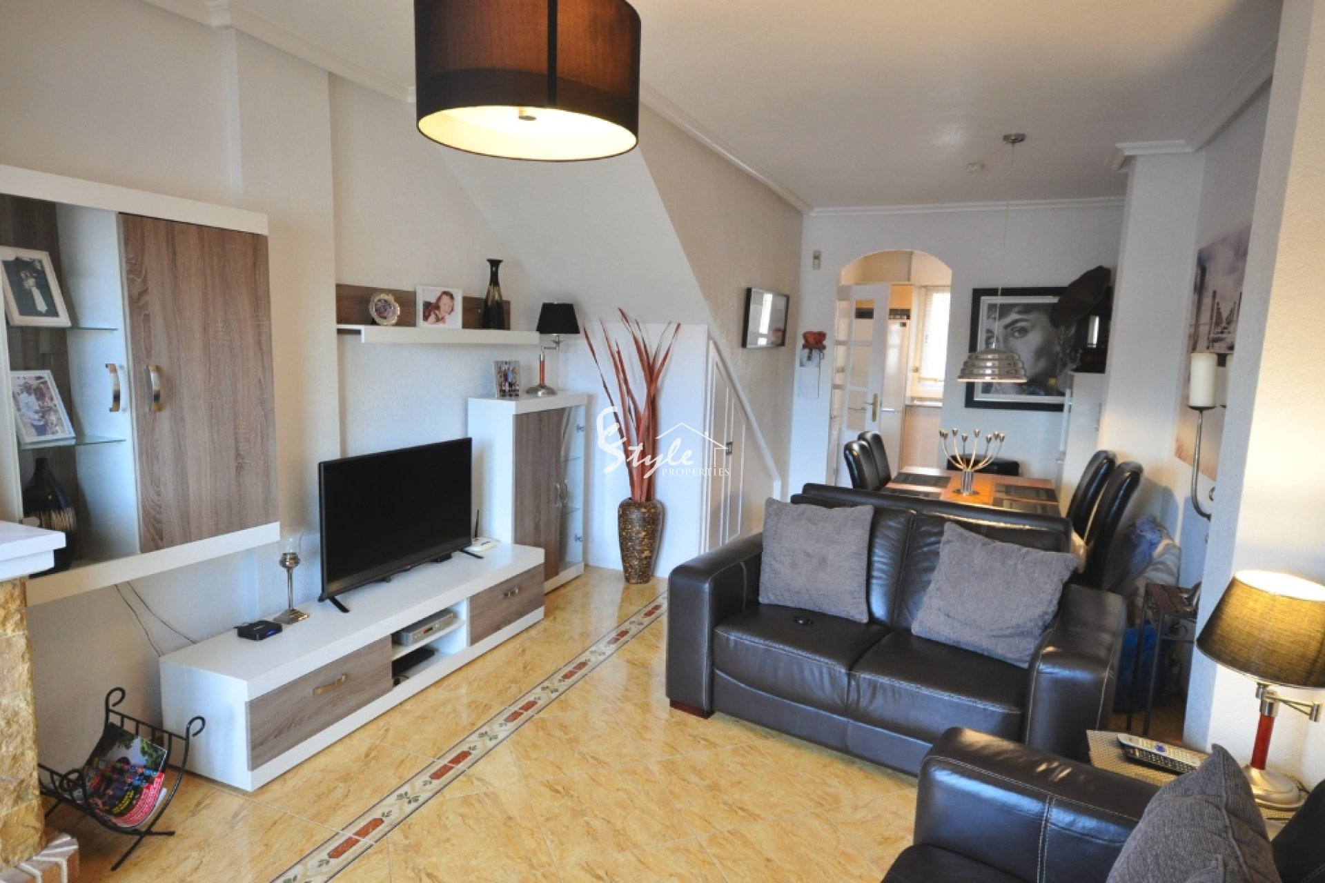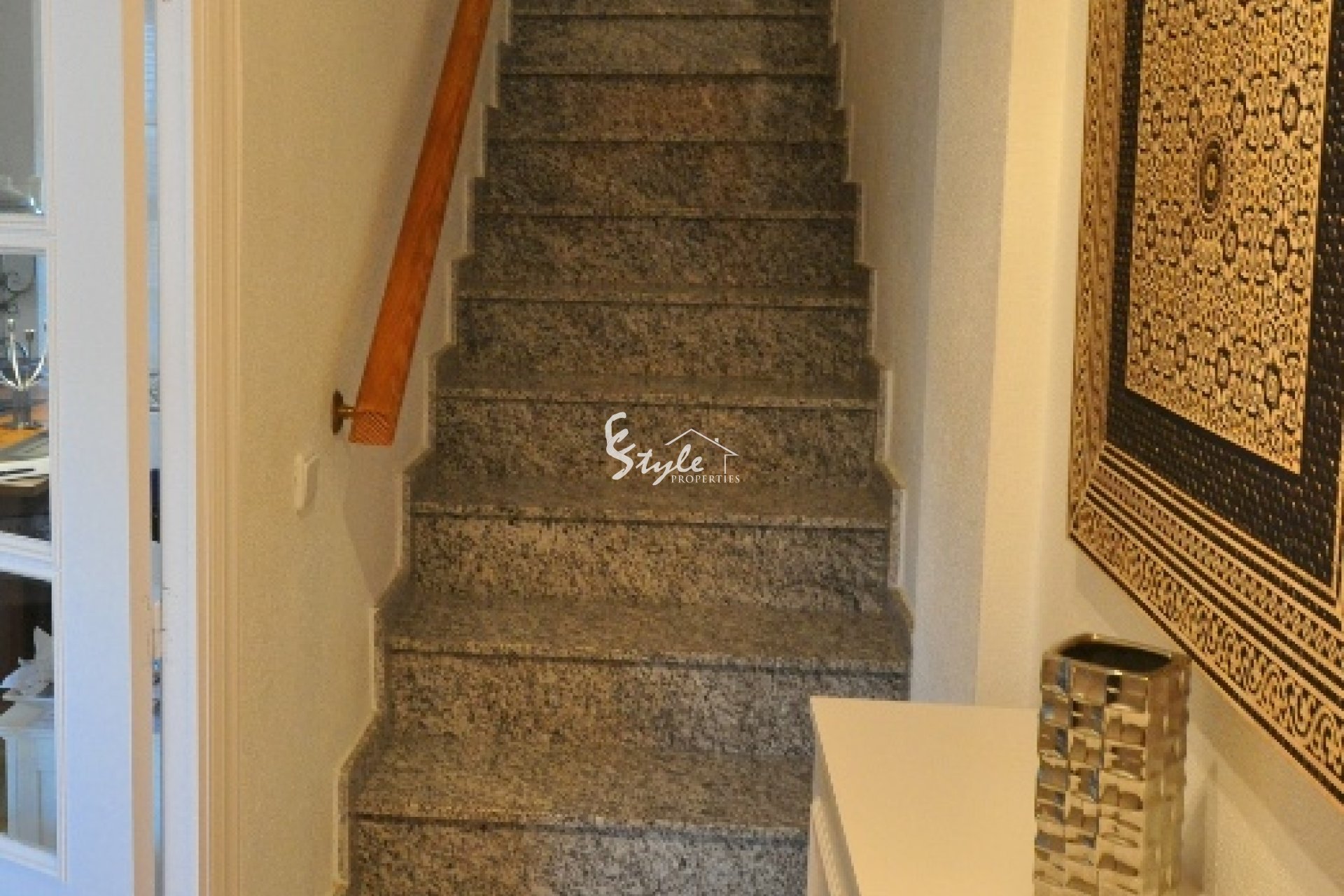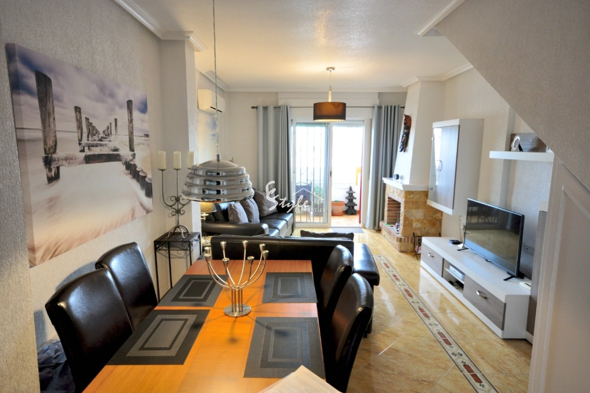 На первом этаже в квартире расположен просторный салон с камином и столовой, открытая кухня и уютная южная терраса. На втором этаже находятся обе спальни, каждая с собственным балконом и ванная комната.